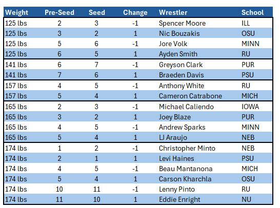 Of the 9 pairs where a seed was flipped, 6 of those went chalk (the wrestler who was bumped up outplaced the wrestler who was dropped down), and 3 went the opposite.