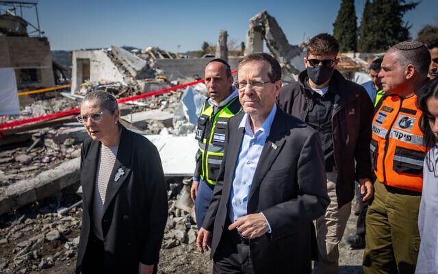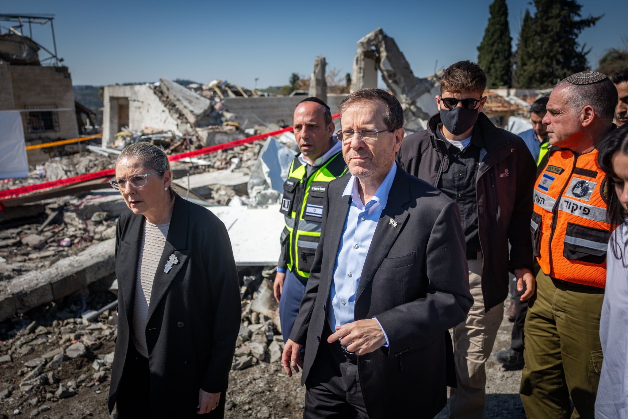 President Isaac Herzog visits the scene where a ballistic missile fired from Iran struck Beit Shemesh, central Israel, causing extensive destruction and killing at least nine people, March 2, 2026. (Yonatan Sindel/Flash90)