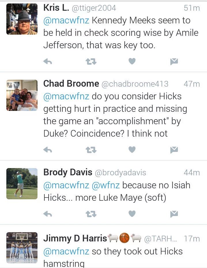 Regarding Hicks, look after what we've gone through as fans from having 3 of the 4 frosh out to start the season then Amile gets hurt again. The Coach misses what? 7 games himself. After all of that my sympathy meter for other teams missing a player is at a big red ZERO. Duke could very well be much further along had none of these injuries happened and UNC had more than enough firepower to win last night.
