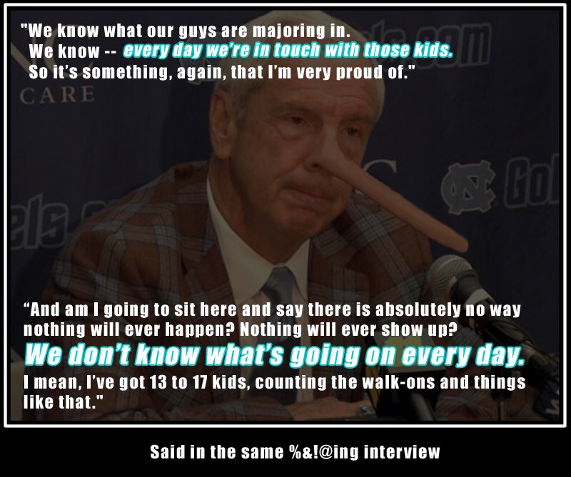 You do realize Roy had the most players enrolled in that curriculum out any of the coaches correct? Once things became suspicious, Roy knew it was time to pull his athletes from the curriculum. Saint Roy knew what was going on and was very active in the scandal. There's no telling what type of scandal he'll be involved in now, the NCAA basically gave UNC the green light to cheat moving forward.