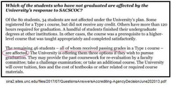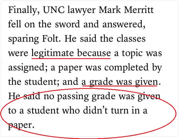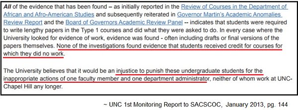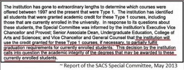 I like how unx defended their concession of academic fraud to SACS by saying , “It was a typo.” Lulz. Setting aside the shamelessness of that explanation for a moment , if it was indeed a typo why did unx accept the penalties from SACS?Basically, the ruling is that if you want to help your “student” athletes cheat academically, allow enrollment in bogus classes for every student. Then, it’s not cheating.