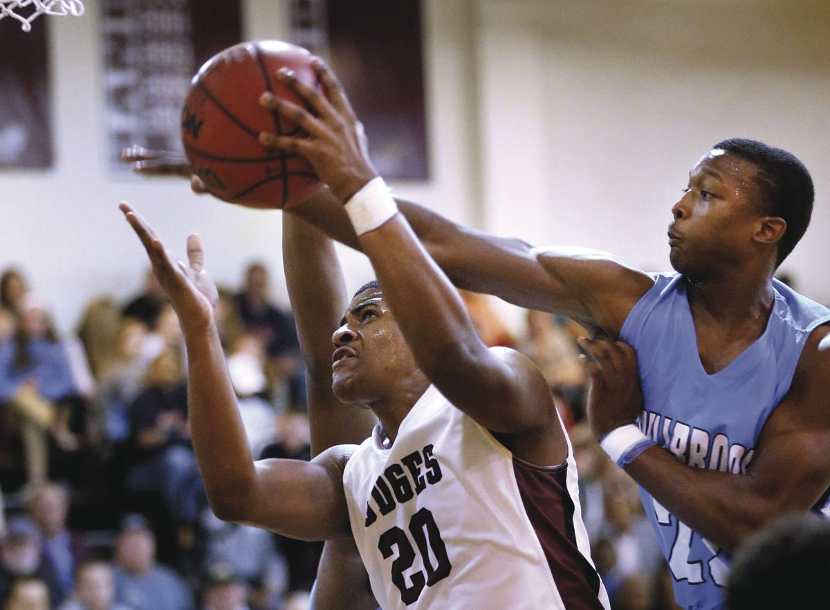 Handley’s D’Andre James works his way to the basket as Millbrook’s Trammell Anthony defends during Tuesday’s Northwestern District clash. James had 14 points to help the Judges net a 64-61 win over the Pioneers.