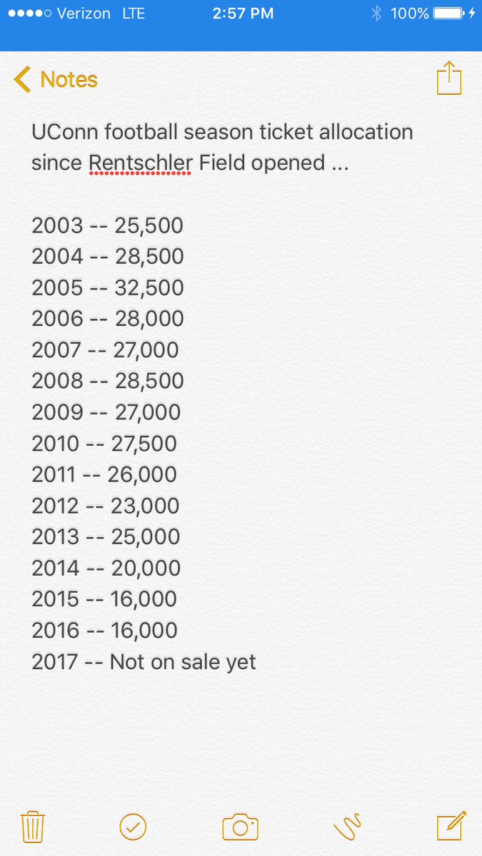Then we just go about cherry picking games or for half price on the secondary market like 16,000 fans that used to buy seasons tix do now...... So how does that help the money base in the long run ?....the other variable could be that Benedict doesn't believe this game has any value to the fanbase in terms of sales, especially if Uconn tanks another season, so he's selling it high now rather than having a dead Rentschler Field with a 2-8 team in November.