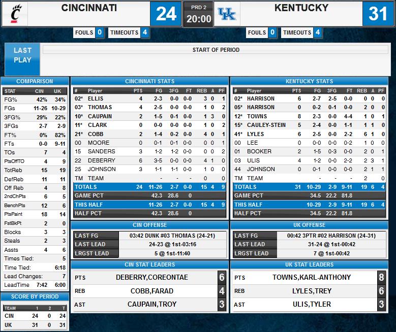 UK shot 34.5 percent for the half, but made 4 of its last 6. Cats have a 19-15 rebounding edge, 7-4 in turnovers.