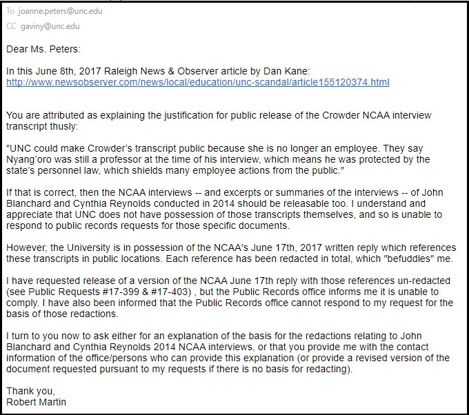 John Blanchard and Cynthia Reynold interview transcripts just might be juicy. UNC isn't being as open with them as with Deb Crowder's