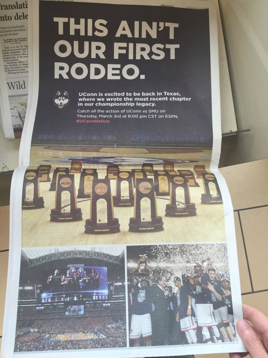 "But that's me. That's not Kevin Ollie. I have been told by a number of people that the men's basketball coach was very upset about the ad. For one, Ollie hadn't known it was coming. There clearly was a failure to communicate by the communications office to the athletic department. It was a mistake." "Am I buying into that the ad fired up SMU? C'mon. Because of various NCAA violations, the Mustangs aren't eligible for the NCAA or AAC tournaments. This was their last home game. It was Senior Night for Nic Moore, Jordan Tolbert and Markus Kennedy ....SMU is playing for the AAC regular season title, the only title SMU can play for — this was their entire season......Beyond being kept in the dark, what upset Ollie evidently is that he perceived the ad as disrespectful of Larry Brown. The SMU coach is a mentor for Ollie. He holds Brown in the highest regard. ......To throw all those postseason trophies in his face when he can play for no postseason trophies this year is a bitter pill for Brown to swallow.."