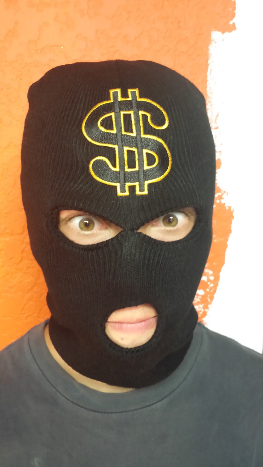 Billy D collects his checks wearing a ski mask and holding a switch blade.